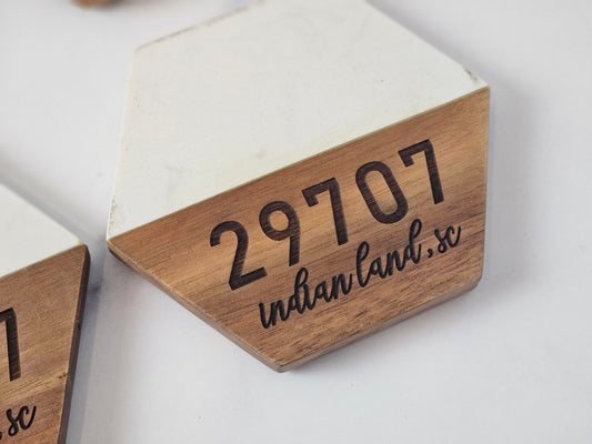 Custom Zip Code Marble & Acacia Wood Coasters (Set of 4)